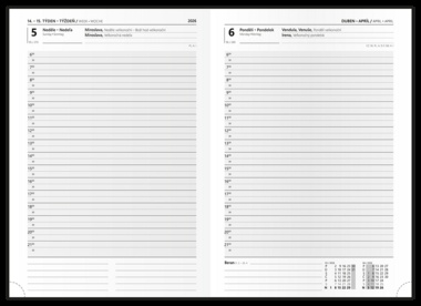 Denní diář A5 vyrobený z oblíbeného materiálu a s jednoduchou ražbou. Výjimečností tohoto diáře je, že soboty i neděle jsou na každé stránce zvlášť. jemný hladký materiál, ražba roku, jednostranná pěnová výplň desek, šitá vazba V8, stužka, kapitálky, perforované rožky, mapa ČR a SR, vlepená kapsa, ofset, 70g/m2