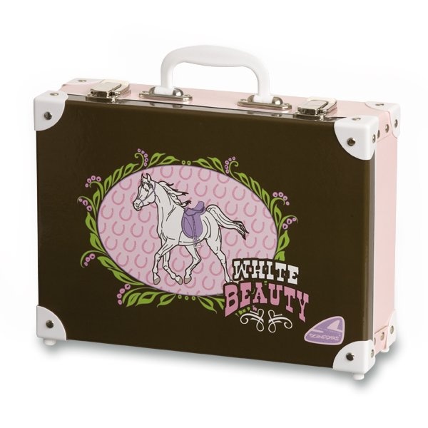 Detský kartónový kufrík so spevnenými rohmi a plastovým držadlom, uzatváranie na kovové zámky. AT://Pappkarton für Kinder mit verstärkten Ecken und Kunststoffgriff, der mit Metallschlössern verschlossen wird.