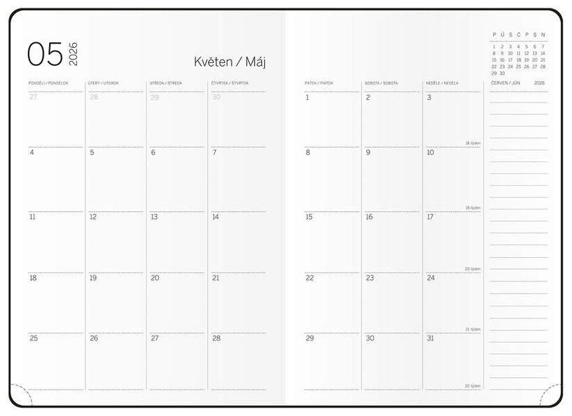Unikátní měsíční diář s poznámkovým notesem. Na předních stranách tohoto managerského diáře můžete využít přehledné měsíční kalendárium a na zbývajících stranách na Vás čeká linkovaný i prázdný blok na Vaše poznámky. V8, měkké desky, potah NUBA, jemný materiál - imitace semiše, rovný hřbet, kulaté rohy bez kapitálku, 2x saténová stužka, 1x ražba roku, 128 str.:ofset, 70g, 1/1, 32 str.: ofset 70g, 0/0 (60 linky, 20 prázdné, 80 měsíce + pozn)