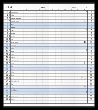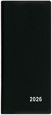 Jednoduchý a praktický měsíční diář vyrobený z jemného hladkého materiálu s polomatným povrchem černé barvy. Ideální pro každého, kdo si oblíbil měkkou šitou vazbu. jemný hladký materiál PVC,potisk roku bílou barvou, šitá vazba V1, ofset, 70g/m2