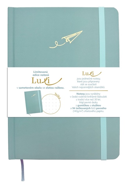 Celý text →Limitovaná edice notesů Luxi s tečkovaným blokem a sametovým přebalem v moderní ledově modré barvě se zlatým motivem vlaštovky. Stylový notes se stuhou a gum...