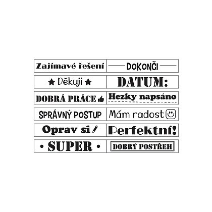 Razítko Roll' Stamp pro paní učitelky a pány učitele s 12 českými nápisy, které šetří čas při kontrole úkolů, písemek i slohových prací. Funguje jako klasická datumovka – nápis se nastaví otočným pohybem a razítko se namočí do razítkovacího polštářku.