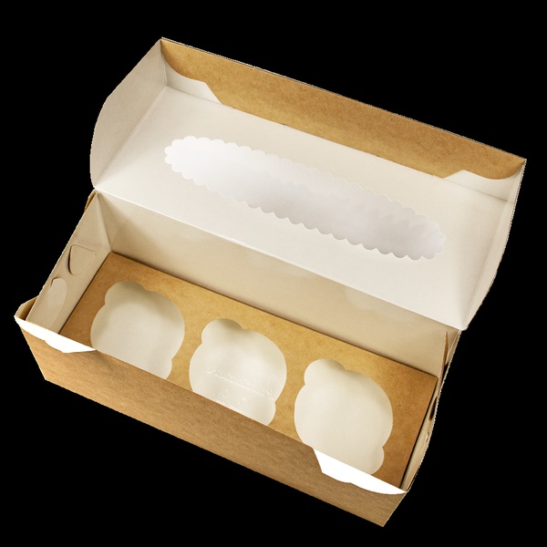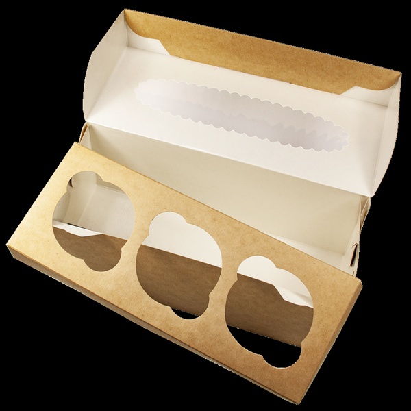 Papierové krabičky na 3 muffiny s okienkom 250x100x100 mm hnedé sú obľúbeným ekologickým papierovým obalom, ktorý sa používa na odnos a prepravu tort, cukroviniek a zákuskov, najmä obľúbených muffin.