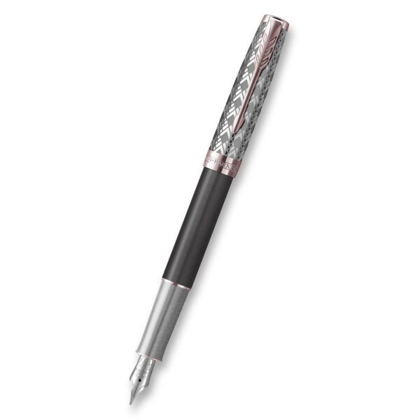 Plniace pero Parker Sonnet Premium Metal Grey PGT má šedo lakované telo a viečko z leštenej nerezovej ocele s ozdobným vzorom vytvoreným leptaním. V kombinácii s doplnkami pokovovanými ružovým zlatom. Hrot z 18-karátového zlata (rýdzosť Au 750/1000) s krí