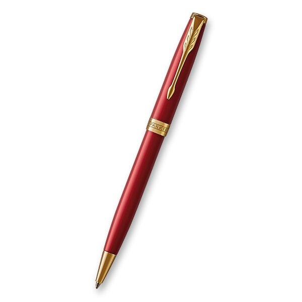 Sada obsahuje černé kožené pero a kuličkové pero Parker Sonnet Red s červeně lakovaným tělem, v kombinaci s doplňky pokovenými zlatem.