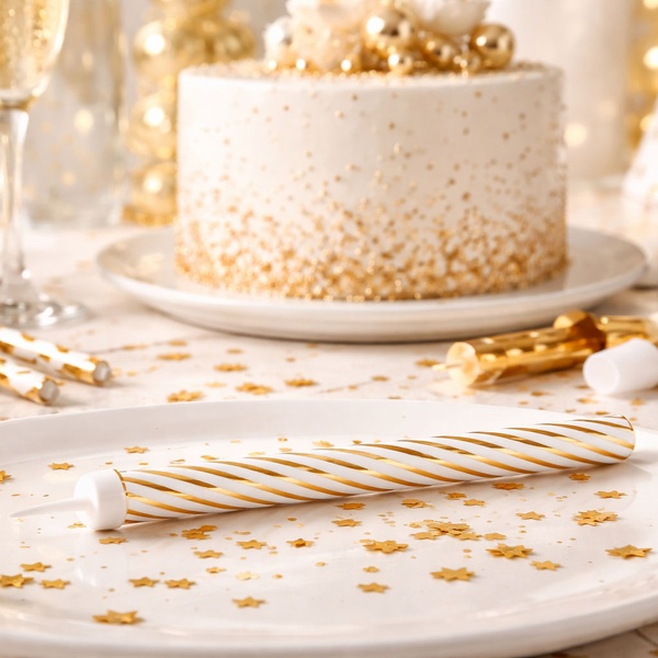 Párty fontána na tortu 12 cm so zlatými prúžkami je štýlová dekorácia na narodeninové torty, dezerty a slávnostné servírovanie. Po zapálení vytvára výrazný iskriaci efekt, ktorý zvýrazní narodeninové oslavy, výročia aj ďalšie párty udalosti.