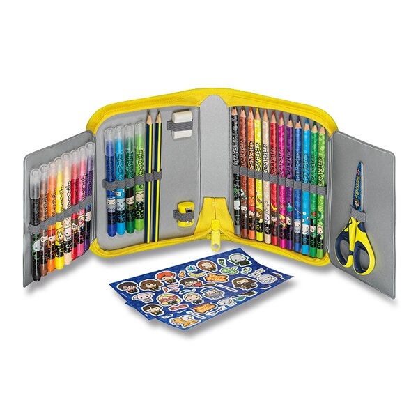 Obsah penálu: 12 fixů Harry Potter, 12 pastelek Harry Potter, 2 grafitové tužky, 13cm nůžky se zaoblenými konci (vhodné pro děti od 4 let), ořezávátko, pryž a 2 archy samolepek s motivy Harryho Pottera.