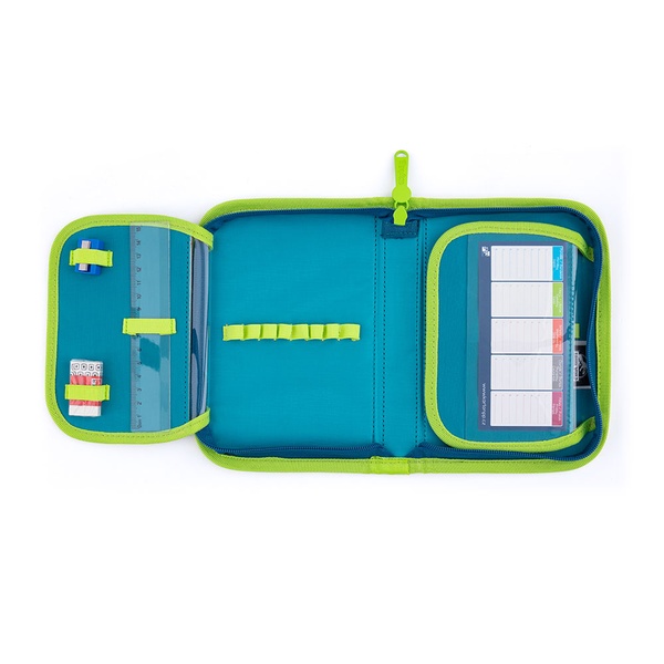 Jednopatrový školský peračník s 2 chlopňami, prázdny obsahuje 25 gumových pútok na uchytenie písacích potrieb.