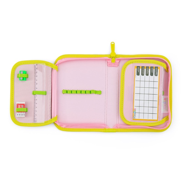 Jednopatrový školský peračník s 2 chlopňami, prázdny obsahuje 25 gumových pútok na uchytenie písacích potrieb.
