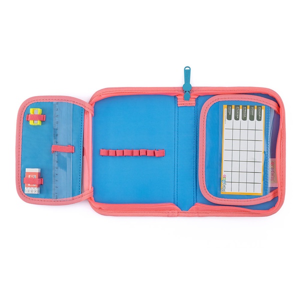 Jednopatrový školský peračník s 2 chlopňami, prázdny obsahuje 25 gumových pútok na uchytenie písacích potrieb.