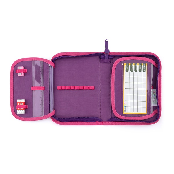 Jednopatrový školský peračník s 2 chlopňami, prázdny obsahuje 25 gumových pútok na uchytenie písacích potrieb.