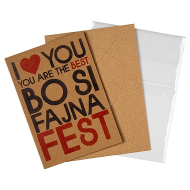 Láska se dá vyjádřit různými způsoby. Originální přáníčko pro ty, které chcete potěšit a pobavit. Grafika je ručně kreslená a psaná, proto mají BeBechy neomezené možnosti originálních motivů a textů. Přání je vyrobeno z recyklovaných materiálů. Kraft je odolný a uchovává si přirozenou barvu a texturu, která nám je velmi sympatická. Zároveň výroba tohoto papíru není nijak složitá, a tak minimálně zatěžuje životní prostředí. V ceně balení je recyklovatelná obálka a průsvitná fólie.
