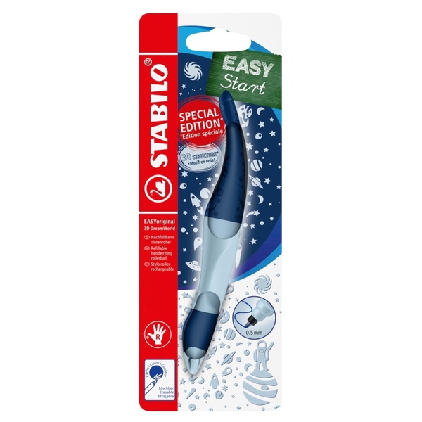 STABILO EASYoriginal 3D DreamWorld zo špeciálnej edície je ergonomický roller navrhnutý pre žiakov základných škôl a začiatočníkov v písaní. Unikátna hmatateľná 3D štruktúra na tele pera prináša zábavný zmyslový zážitok a zároveň podporuje správny úchop aj rozvoj rukopisu. Dizajn inšpirovaný dobrodružným vesmírom vtiahne deti do sveta fantázie.