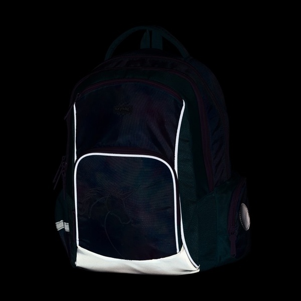 Vnútorný priestor batohu ponúka dostatok miesta pre učebnice, zošity aj ďalšie školské potreby. Pevné nepremokavé dno chráni obsah batohu pred vlhkosťou, zašpinením aj pretečením. Bočné vrecká – jedno na zips a jedno otvorené – sú ideálne napríklad na fľašu s pitím alebo drobnosti. Reflexné prvky zvyšujú bezpečnosť dieťaťa na ceste do školy.