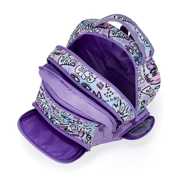 Dve vnútorné vrecká poskytujú dostatok priestoru pre učebnice, zošity aj veci na voľný čas. Pevné nepremokavé dno chráni obsah pred ušpinením aj prípadným vytečením tekutín. Po stranách sa nachádzajú dve menšie vrecká – jedno otvorené a druhé na zips. Batoh ponúka veľkorysé množstvo ďalších vreciek pre prehľadné usporiadanie všetkých potrieb.
