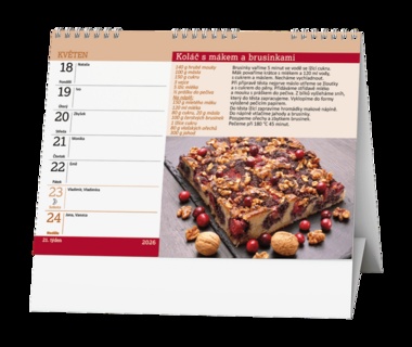 Stolní kalendář s týdenním kalendáriem pro všechny milovníky sladkého i slaného pečení. Papír: G print, 100 g/m2 Obálka: křída lesk 135 g/m2 Stojánek je z kvalitní bílé lepenky 600g/m2 Dělená kovová spirála "twin wire"