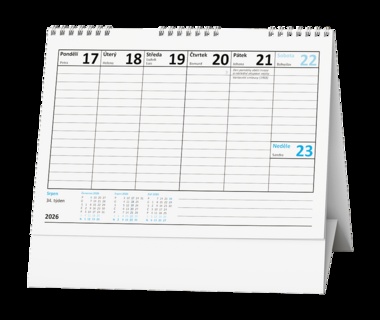 Jednoduchý a praktický pracovní kalendář s týdenním kalendáriem v modro-bílé barevné kombinaci. Celý text →
