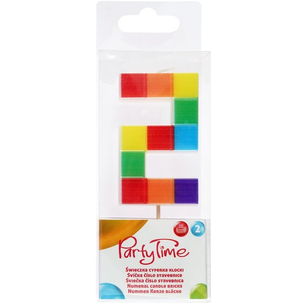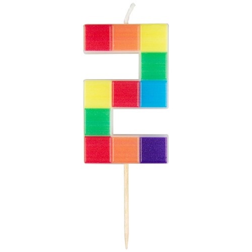 Narodeninová sviečka číslo 2 s motívom stavebnice je výrazná dekorácia na tortu pre detské oslavy a narodeniny. Farebný motív stavebnice dodá torte veselý vzhľad.