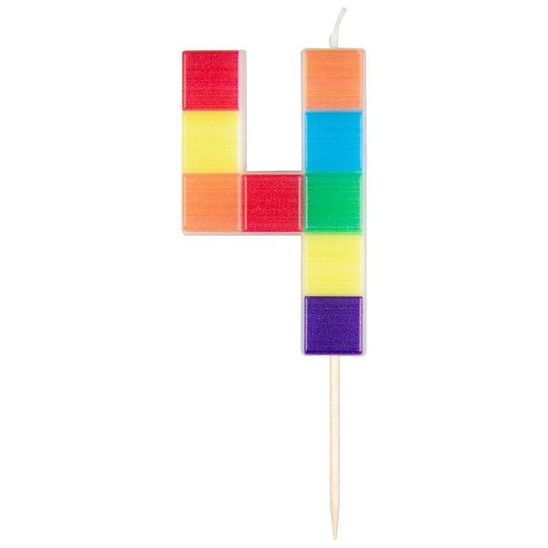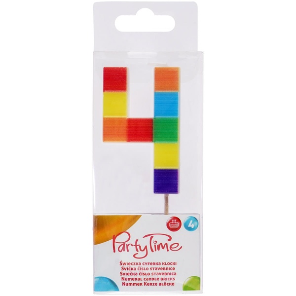 Narodeninová sviečka číslo 4 s motívom stavebnice je výrazná dekorácia na tortu pre detské oslavy a narodeniny. Farebný motív stavebnice dodá torte veselý vzhľad.
