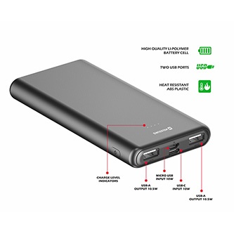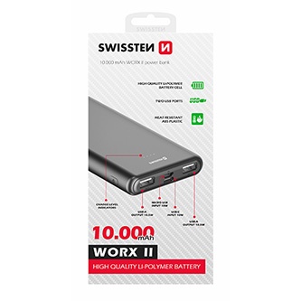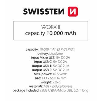 Popis produktu Powerbanka SWISSTEN WORKS II 10.000mAh so vstupmi USB-C a Micro USB a dvoma výstupmi USB-A s celkovým výkonom 10,5W.