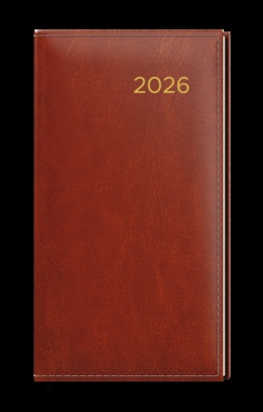 Týdenní kapesní diář vyrobený z hnědé koženky s moderní zlatou ražbou roku. Diář, který povýší jakoukoli Vaši schůzku. jemný hladký materiál s lesklým povrchem, ražba roku, obšití v béžové barvě, šitá vazba V8, stužka, perforované rožky, ofset, 70g/m2, krémový papír