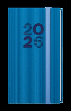 Kapesní týdenní diář v modré barvě ze strukturovaného materiálu a s gumičkou. Jednoduchost, která neomrzí. Moderní doplněk do každé kapsy. Diář má velký prostor pro poznámky a plánování. strukturovaný materiál, ražba roku, šitá vazba V8, stužka, perforované rožky, gumička, ofset, 70g/m2