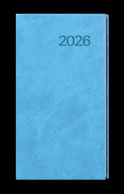 Kapesní týdenní diář ve světle modré barvě je vyráběný z jemné hladké vivelly. Trendy a praktický doplněk do každé kapsy. Diář má velký prostor pro poznámky a plánování. jemný hladký materiál, ražba roku, šitá vazba V8, stužka, perforované rožky, ofset, 70g/m2