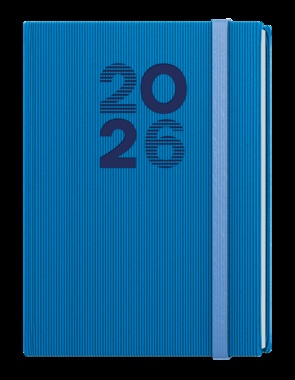 Týdenní diář formátu A5 vyrobený ze strukturovaného materiálu v modré barvě a s gumičkou. Oblíbená grafika vnitřního bloku Vám pomůže účelně plánovat Vaše dny. strukturovaný materiál, ražba roku, jednostranná pěnová výplň desek, šitá vazba V8, kapitálky, stužka, perforované rožky, mapa ČR a SR, vlepená kapsa, gumička, ofset, 70g/m2