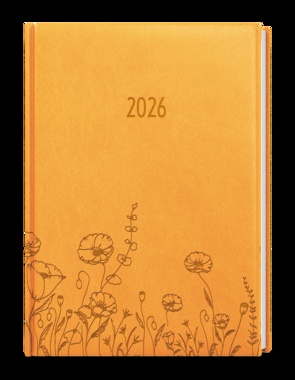 Týdenní diář v okrové vivelle s krásnou ražbou s motivem Květin. Diář v oblíbeném formátu s velkým prostorem pro poznámky a plánování. jemný hladký materiál, ražba motivu a roku, šitá vazba V8, stužka, perforované rožky, vlepená kapsa, ofset, 70g/m2